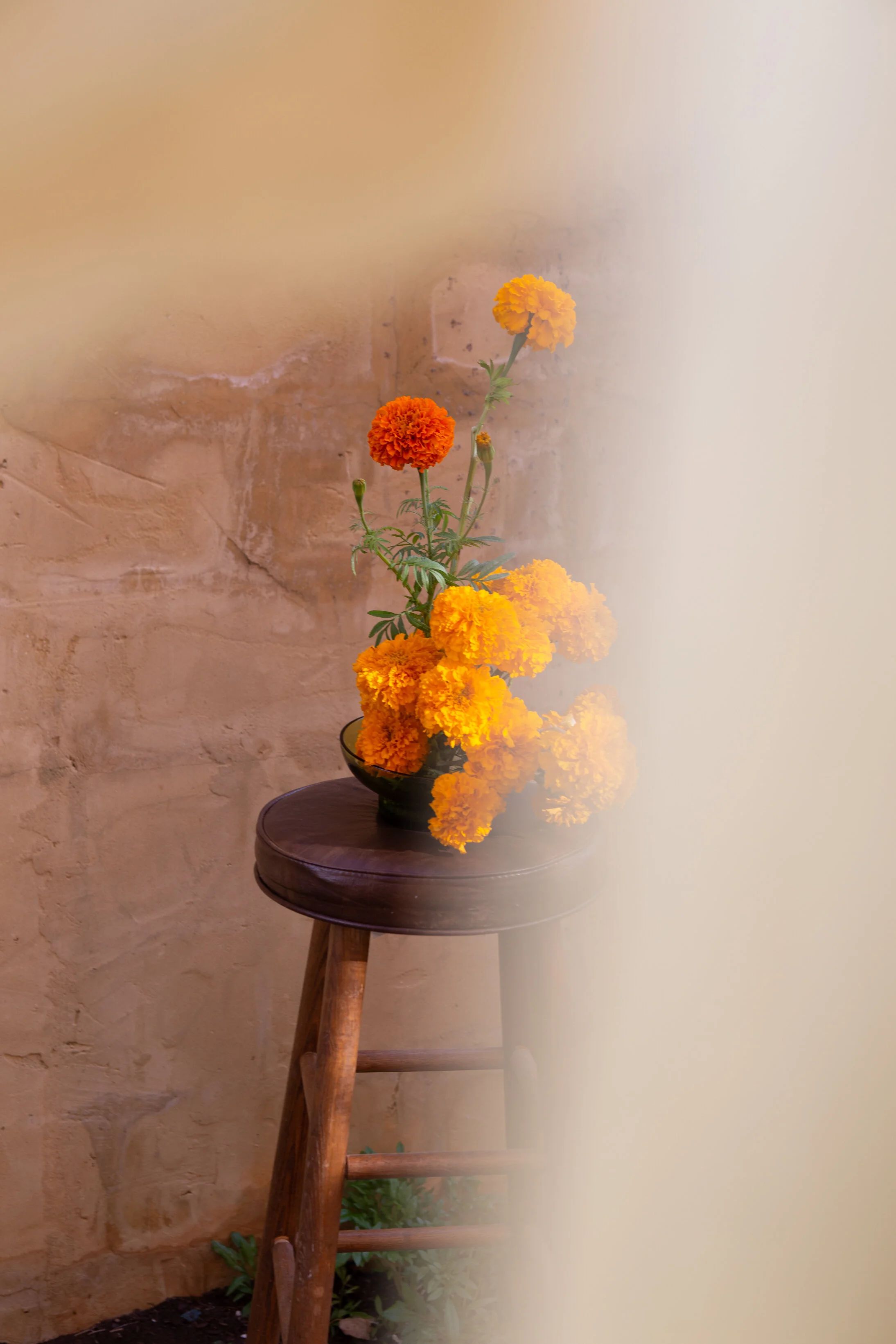 This private installation took place on October 19, 2020, three years after Kaleena was killed in a motorcycle accident, as a project of personal healing and remembrance. To process her emotions on this anniversary, An wanted to spend the day working with her textiles and enlisted Arrin to create two marigold centerpieces. Pulling in various marigold dyed fabrics, An surrounded the live floral arrangements with the flowing panels, capturing ephemeral interactions between the flowers and fabric on camera.
