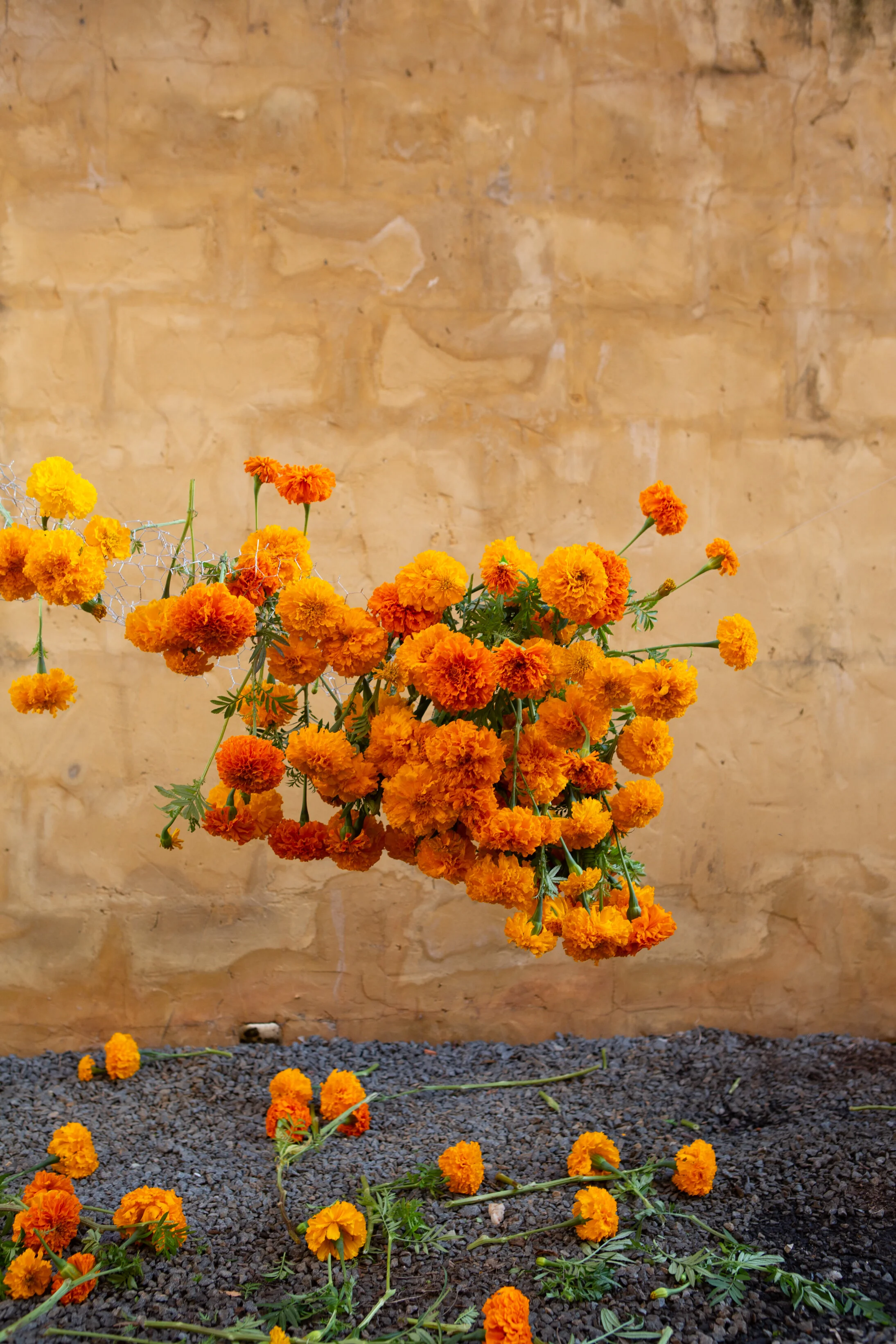 This project is about the act of making and creating as a way for the living to mourn and honor lost ones. The marigold flowers in this installation were dried by the artists and will be used as dyestuff for future textiles, giving second life to the plant matter.